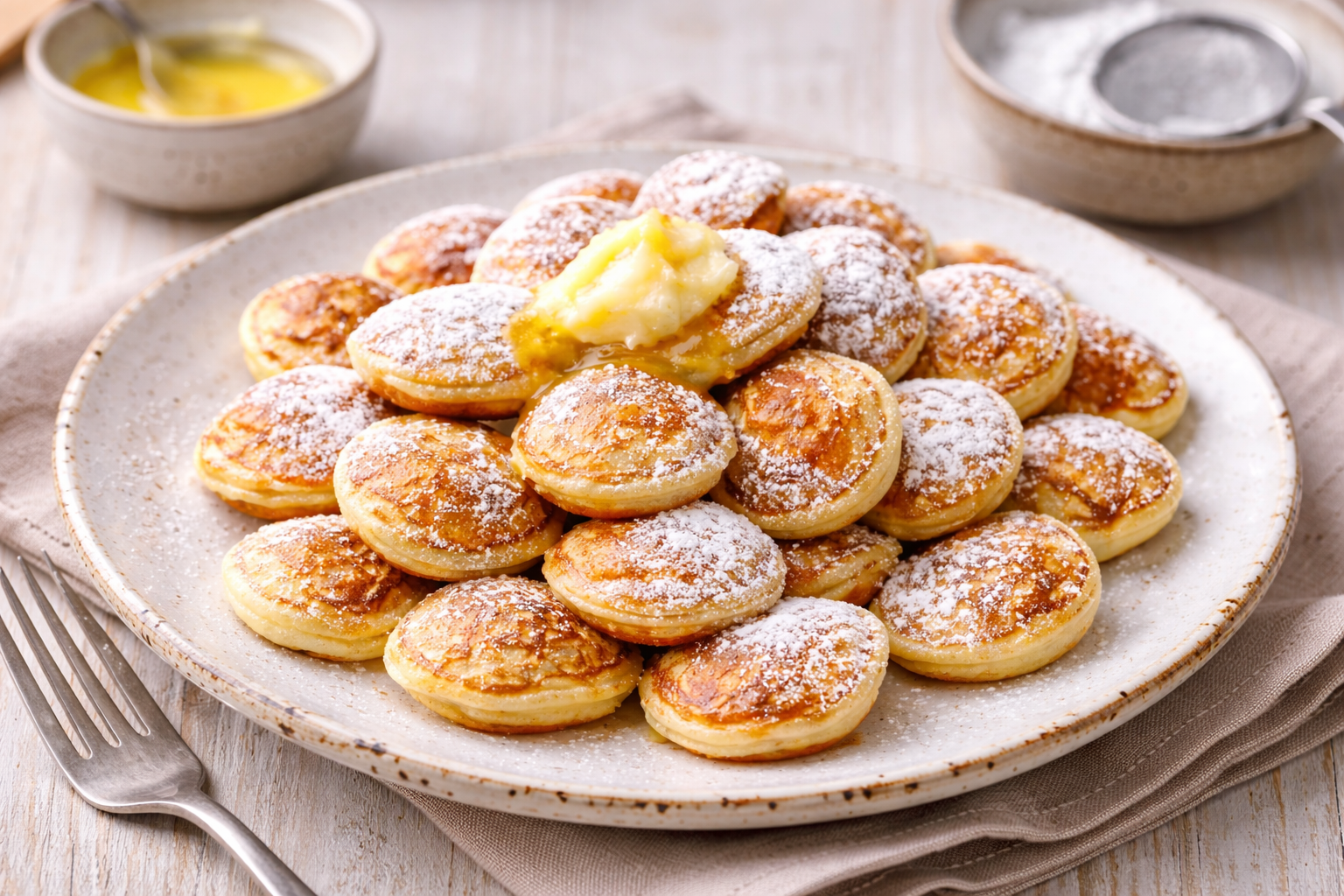 Soft, fluffy Dutch mini pancakes made with yeast and a little buckwheat. Serve hot with melted butter and plenty of icing sugar.When made professionally, these